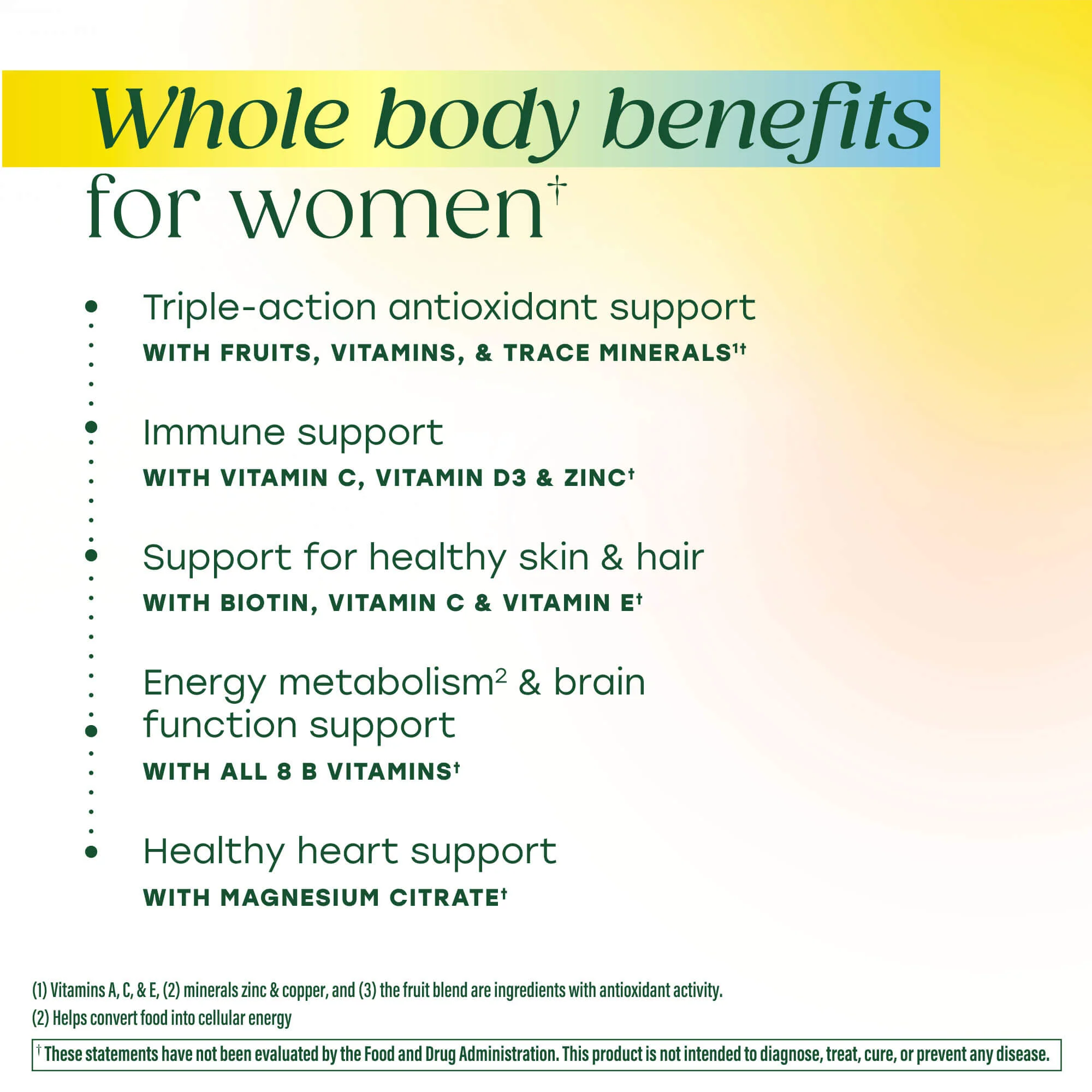 Get whole body health support expertly formulated for women. Crafted with 20 nutrients plus real food, these gummies pack tasty strawberry flavor alongside essential everyday support.†